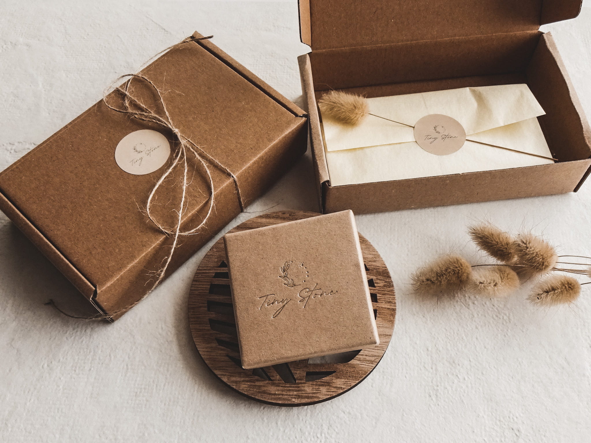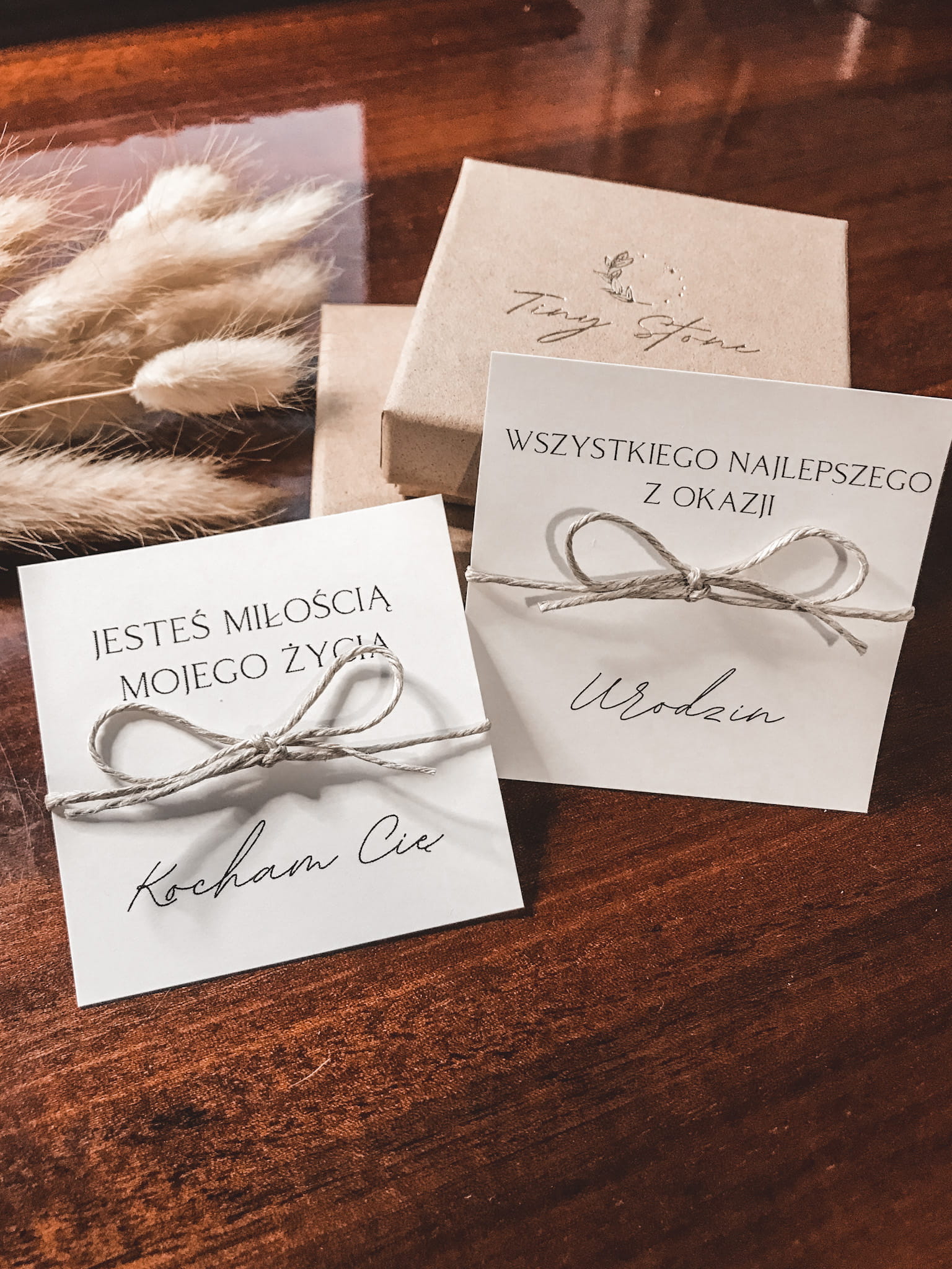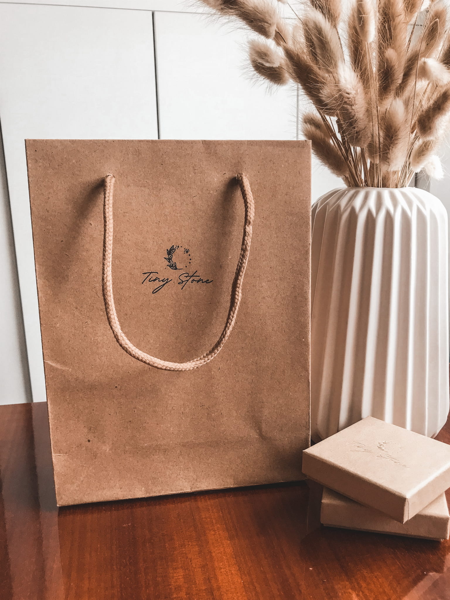Biżuteria pakowana jest w elegancki kartonik z logo marki, następnie kartonik owijany jest bibułą i dekorowany suszonym dmuszkiem. Całość pakowana jest w większy kartonik przewiązany sznureczkiem. Tak zapakowaną biżuterię możesz od razu podarować na prezent bliskiej osobie.