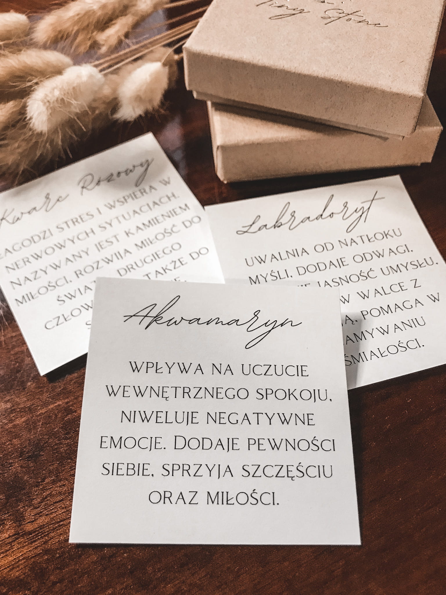 Do biżuterii można dołączyć dedykację, jedną z kilkunastu gotowych propozycji lub swoją własną. Dodatkowo możemy dołączyć także opis właściwości kamieni, z których została wykonana biżuteria.