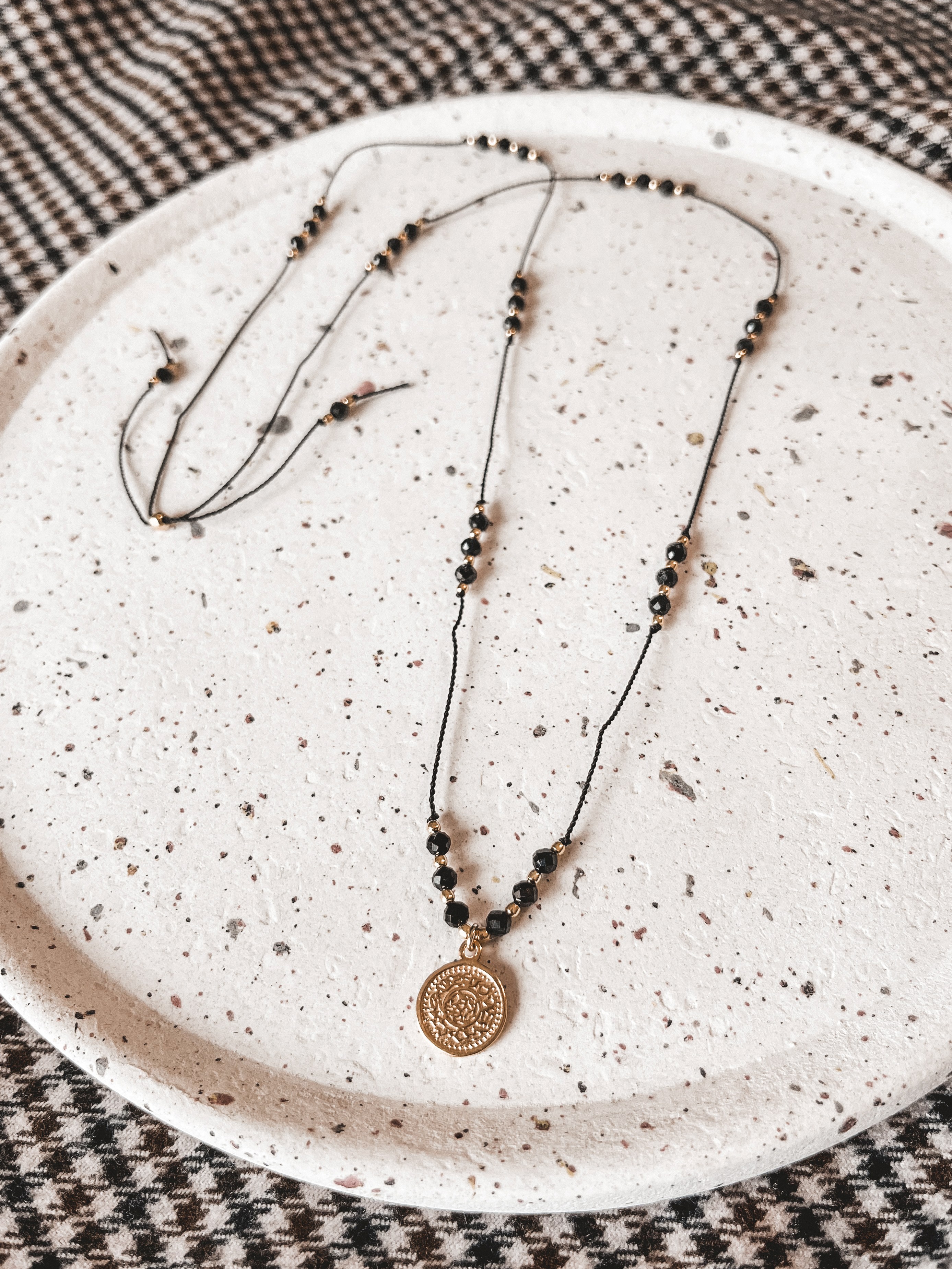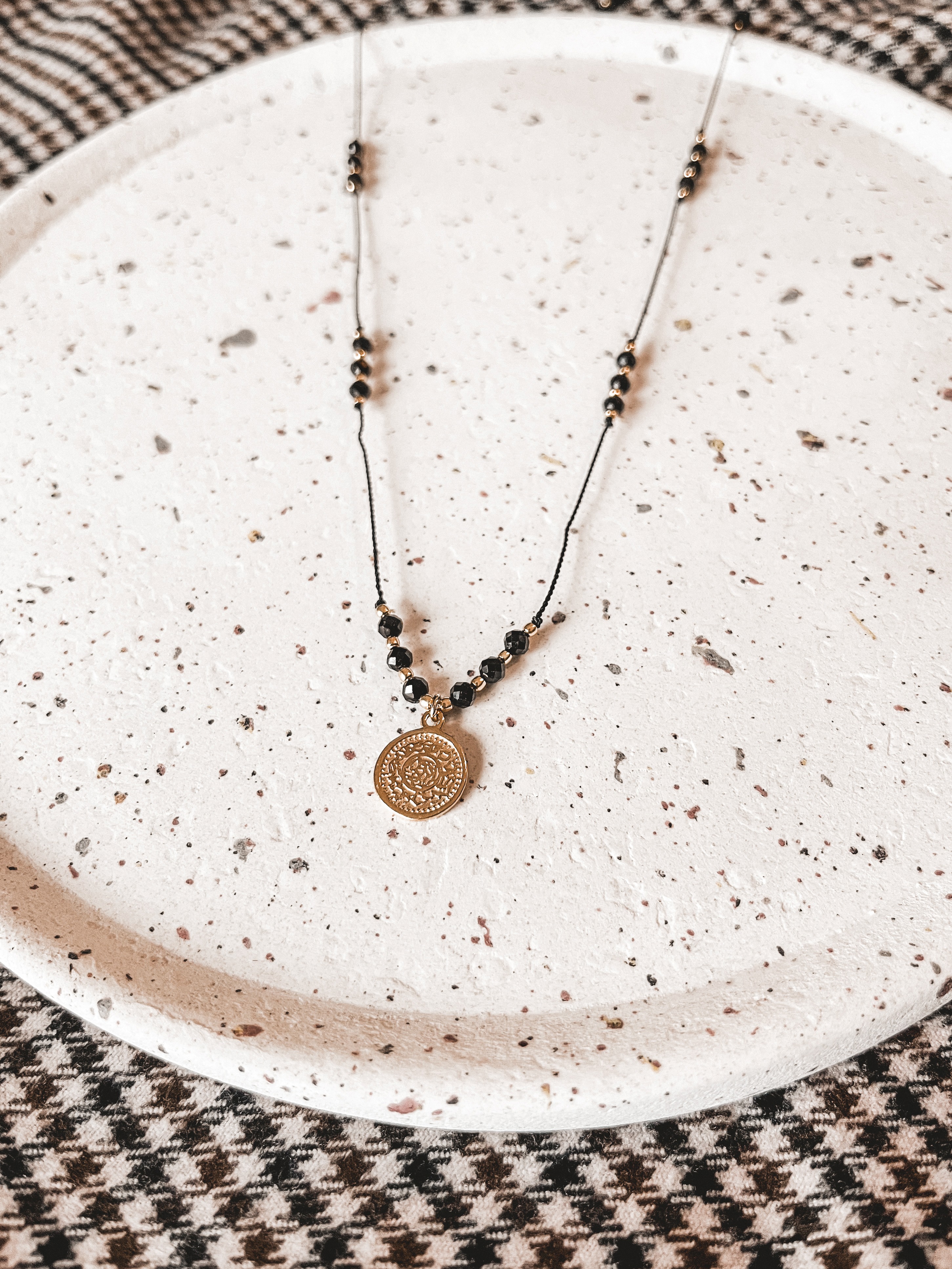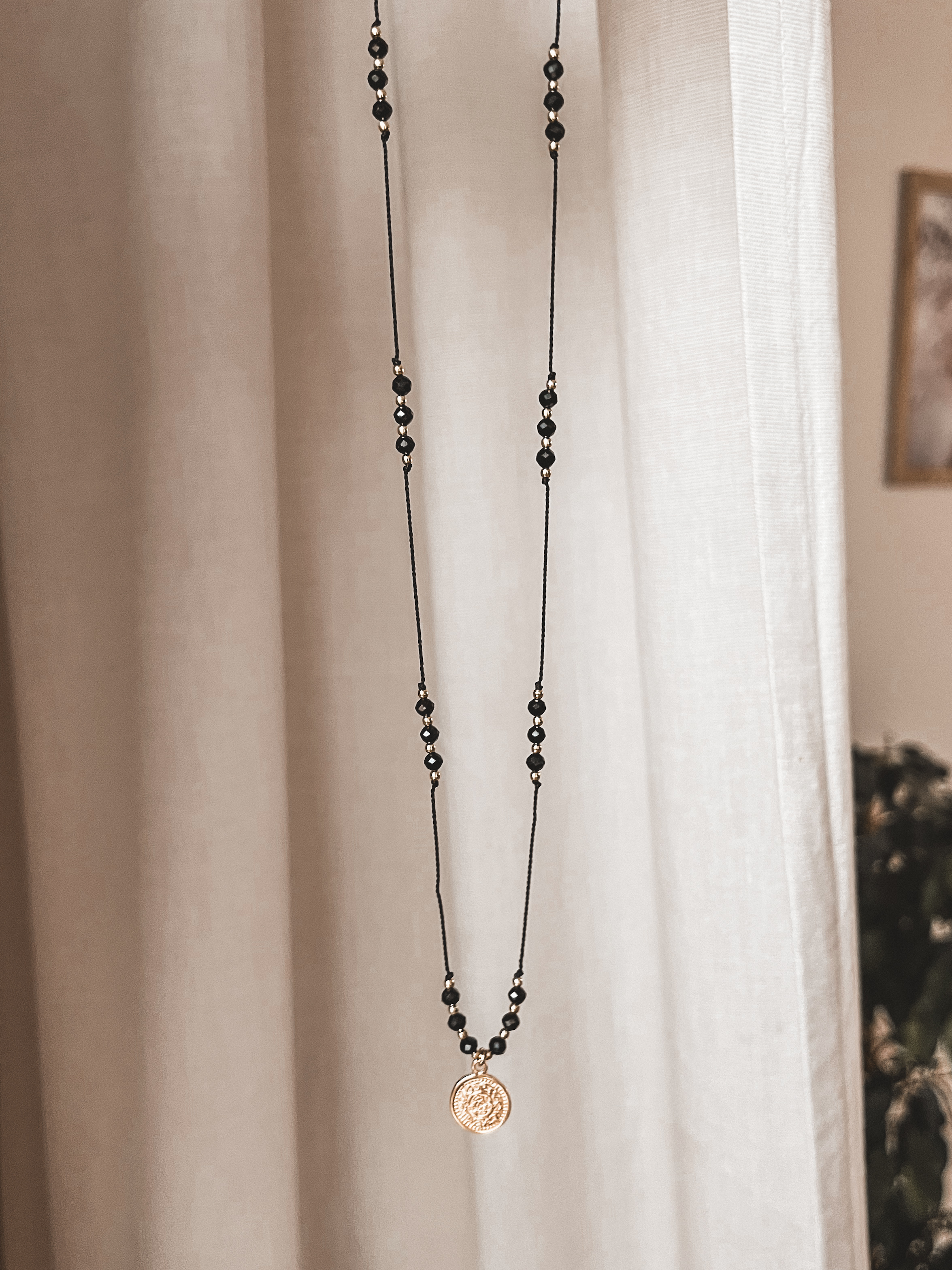 Naszyjnik wykonany z kamieni czarnego turmalinu oraz srebrnych koralików i zawieszki próby 925 pozłacanych 24K złotem. Eleganckie i ponadczasowe połączenie czerni i złota zachwyca swym blaskiem a zarazem prostotą.